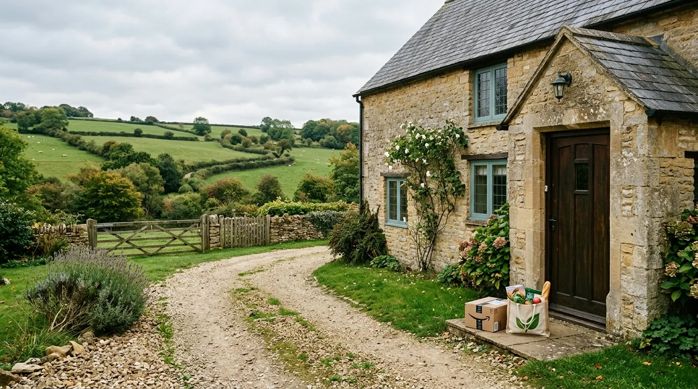 The barn is a converted agricultural building outside a village called Wingham, about seven miles southeast of Canterbury. It is beautiful, guests love it, it commands £280 a night in peak season, and the nearest proper shop is a Co-op in Littlebourne which is 15 minutes by car if you catch the single-track lane without an oncoming tractor. The nearest Tesco is in Whitstable, about 40 minutes. Amazon delivers next day but not same day. There is no Deliveroo, no Uber Eats, no Just Eat. The village has a pub, a church, and a post office that opens four mornings a week.